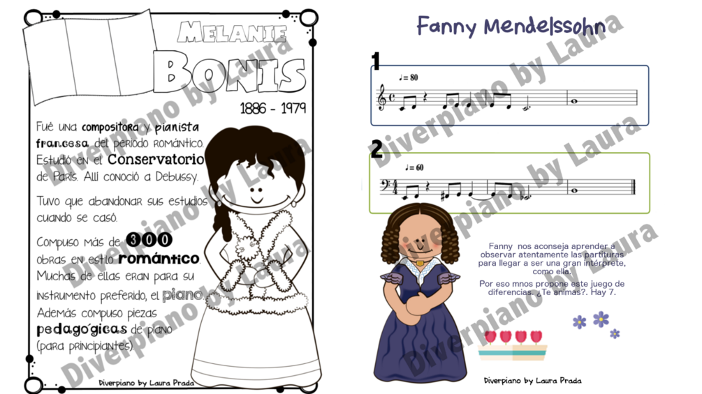 Colección de 8 cuadernillos sobre las compositoras Melanie Bonis, Fanny Mendelssohn, Clara Schumann, Sofia Gubaidulina, Amy Beach, Cecile Chaminade, Elisabeth de la Guerre y Mariana Martinez que incluye una ficha técnica de la compositora, una mini biografía, una ficha de audición y tres fichas de actividades-pasatiempos musicales. Las imágenes de las ocho compositoras son creación del ilustrador José Antonio Vaca Cerezo.