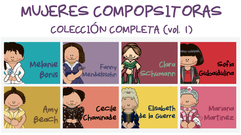 Colección de 8 cuadernillos sobre las compositoras Melanie Bonis, Fanny Mendelssohn, Clara Schumann, Sofia Gubaidulina, Amy Beach, Cecile Chaminade, Elisabeth de la Guerre y Mariana Martinez que incluye una ficha técnica de la compositora, una mini biografía, una ficha de audición y tres fichas de actividades-pasatiempos musicales. Las imágenes de las ocho compositoras son creación del ilustrador José Antonio Vaca Cerezo.